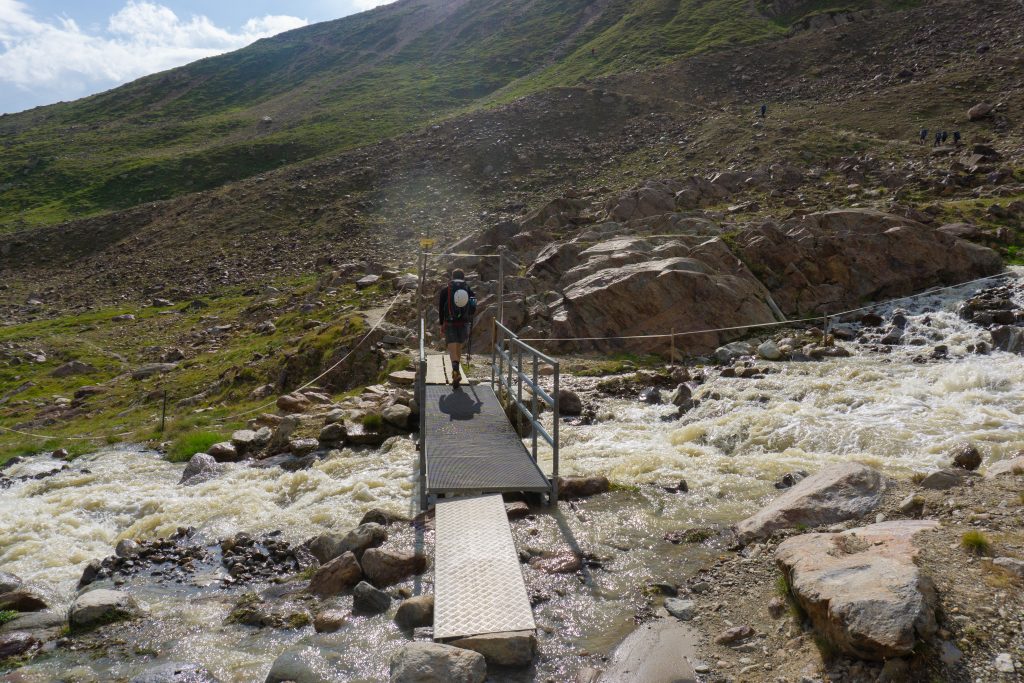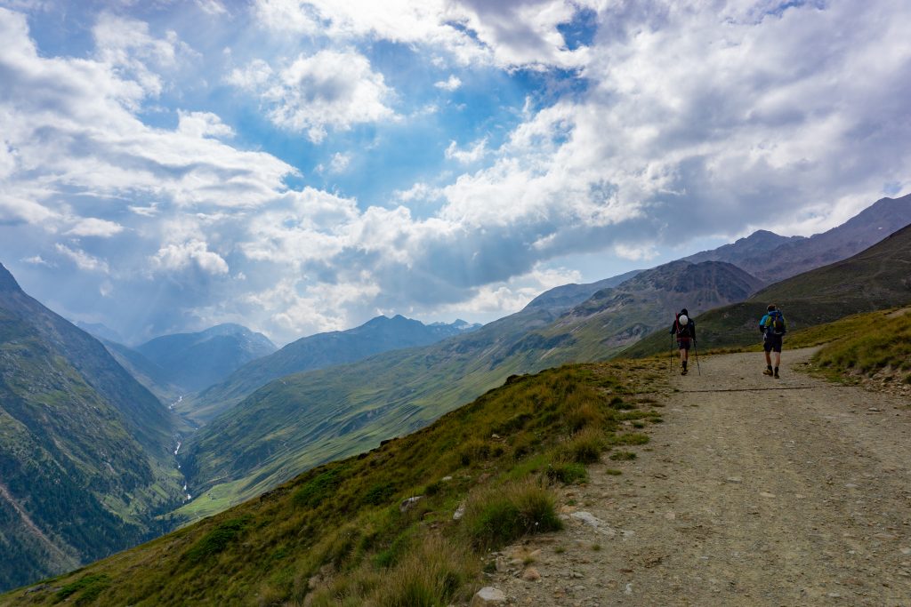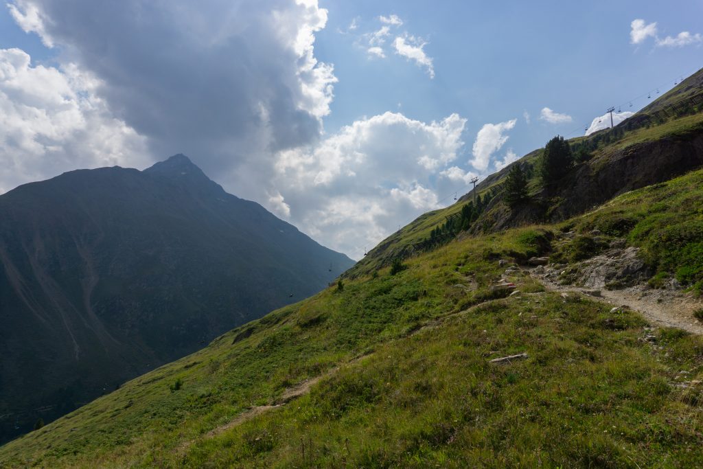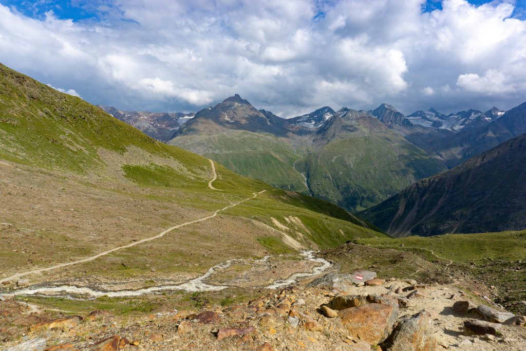 Vom Parkplatz aus geht es gleich recht steil über schmale Pfade zur Bergstation des Wildspitzlifts. Dabei hat man einen tollen Blick auf die Ortschaft Vent, die unter einem immer kleiner wird. Ab der Liftstation geht es zunächst auf breiteren Schotterwegen weiter Richtung Breslauer Hütte. An einer Kehre bekommt man dann schließlich einen grandiosen Ausblick bis nach Italien. Die Gegend ist noch nicht so weit erschlossen, dass man an jeder Ecke Wanderer und Hütten findet, sodass die Landschaft hier noch richtig wild aussieht. Bevor der Schlussanstieg beginnt, quert man auf einer eisernen Brücke einen wilden Gebirgsbach, danach geht es steil bis zur Breslauer Hütte bergan.