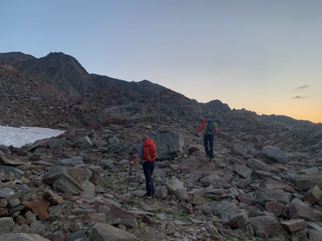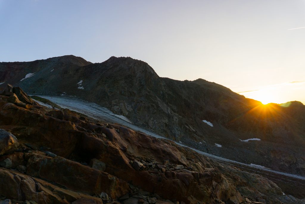 Am Gipfeltag ging es nach einem ordentlichen Hüttenfrühstück gegen 5:30 Uhr los. Am Abend zuvor haben wir uns noch mit einem Bergführer unterhalten, der uns gesagt hat, dass der Normalweg wohl ziemlich unter Steinschlag leide, sodass wir uns kurzerhand umentschlossen haben auf den Jubiläumsgrat auszuweichen. Die Übernachtungssachen, die wir nicht beim Aufstieg brauchten, haben wir in der Hütte im Schuhraum gelassen, um sie auf dem Abstieg wieder abzuholen. Also ging es mit leichtem Gepäck mit dem Sonnenaufgang auf die ersten Höhenmeter.