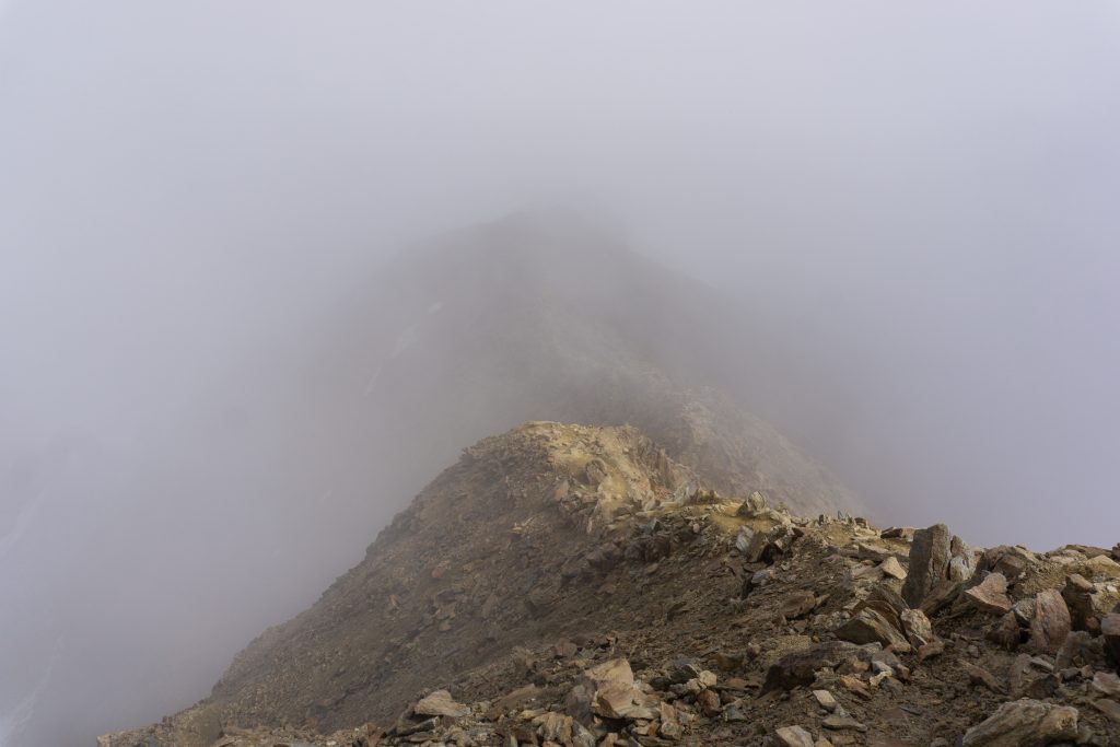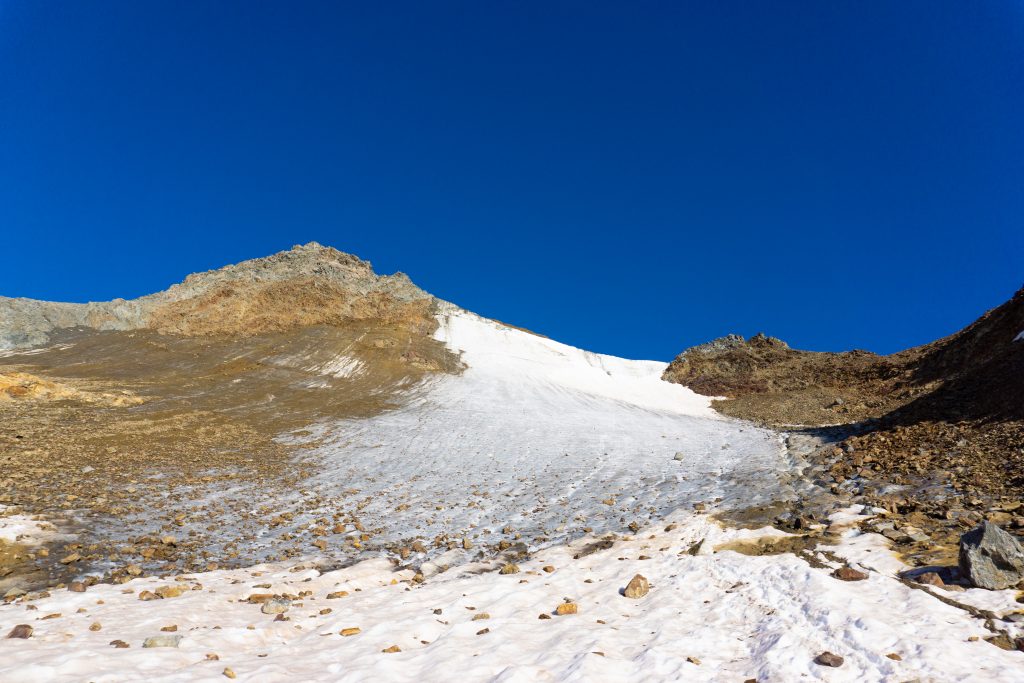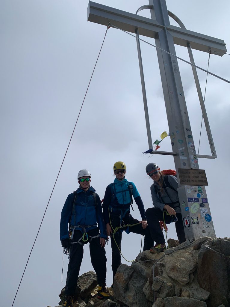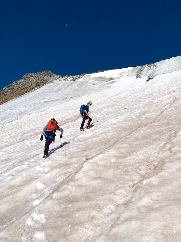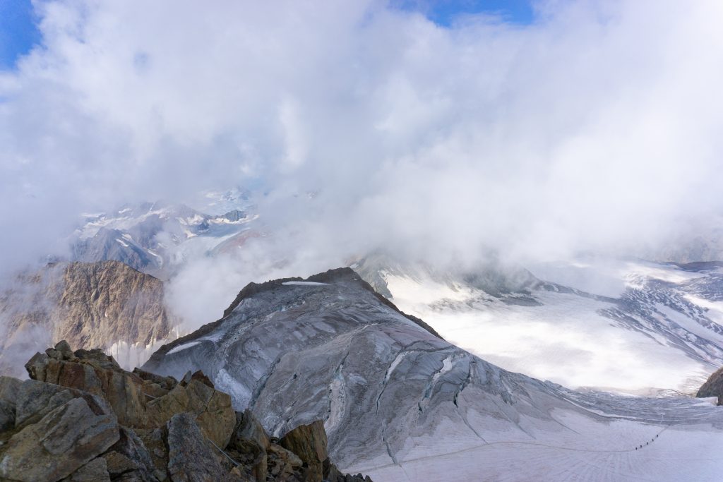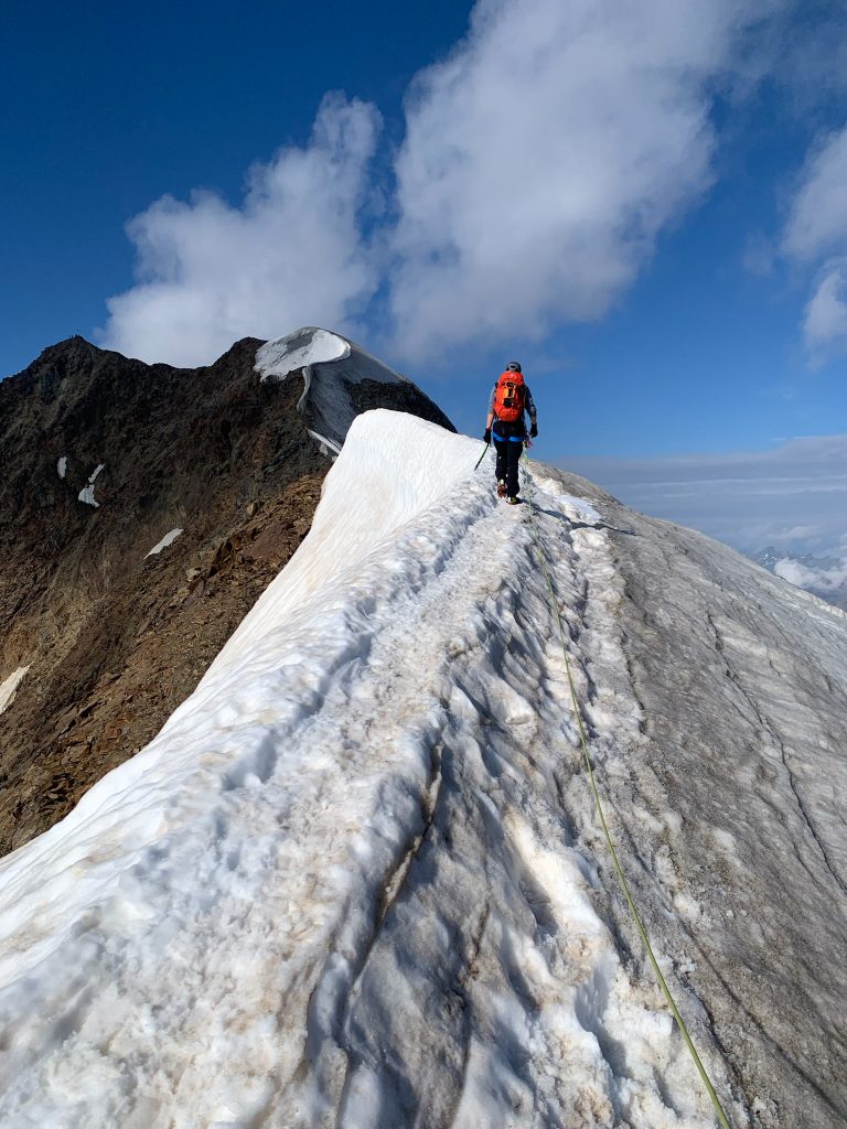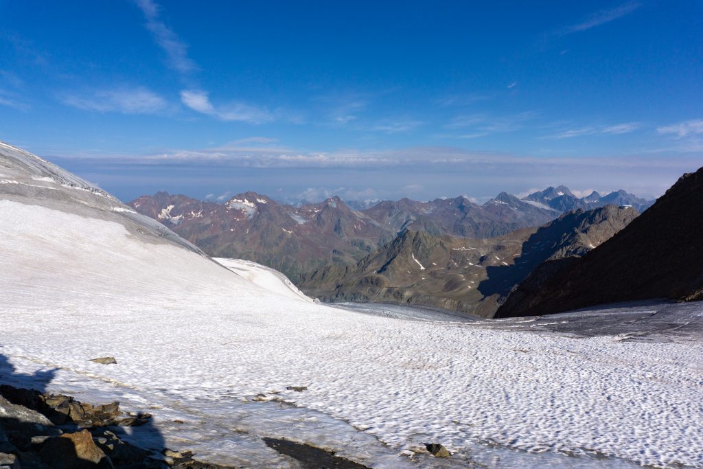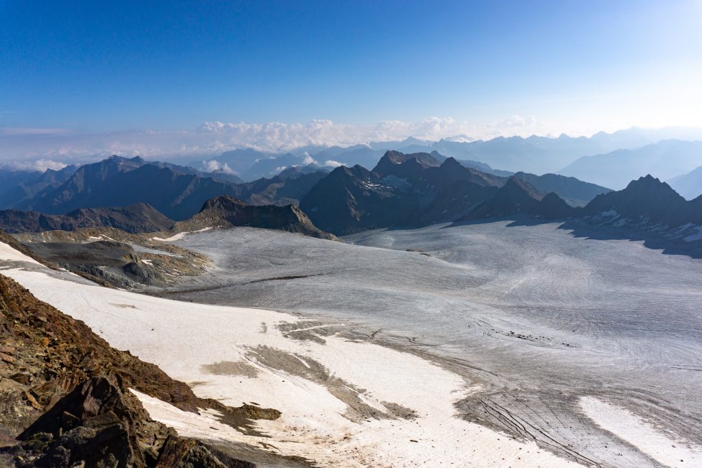 Vor dem ersten Gletscherkontakt geht es ziemlich lang durch ein Geröllfeld hinauf, das wunderbar in der Morgensonne gelegen ist. Die Wegfindung gestaltet sich hier recht interessant, aber letztendlich haben wir immer den richtigen Weg genommen und sind am Rand des Gletschers angekommen. Dort haben wir die Gletscherausrüstung angelegt und sind zunächst recht flach über den Gletscher gewandert. Dieser war im August wirklich komplett aper. Dann beginnt ein relativ anstrengender steiler Teil, bei dem man in dem sulzigen Sommerschnee ordentlich ins Schwitzen kommt. Als wir den oberen Teil des Gletschers einsehen konnte, haben wir uns aufgrund von deutlichem Steinschlag, der kontinuierlich die Eisflanke hinunterfiel, dafür entschieden, auf den schuttartigen steinigen Aufstieg rechtshaltend auszuweichen, wie es auch die Seilschaften vor uns getan haben. Wenn man sich auf diese Schuttflanke gekämpft hat, wird man mit einem einmaligen Blick auf den riesigen Taschachferner belohnt – da kann man es sich nicht verkneifen eine kleine Trinkpause einzulegen und den Ausblick zu genießen. Anschließend geht man über eine relativ steile Eisflanke weiter bergan und schließlich auf den Grat. Dieser war bei uns nur wenig mit Schnee bedeckt, die Kraxelei führt über teils erdiges, teils felsiges Gelände mit vielen losen Steinen. Schließlich kommt das Gifelkreuz in Sicht und unser Timing war mal wieder bescheiden – die Wolken hatten sich genau dann zugezogen, als wir am Gipfel waren. Aber dafür konnten wir ja bereits beim Aufstieg wirklich phänomenale Ausblicke genießen, die schon Belohnung genug waren.