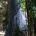 Wenn es die Tage zuvor geregnet hat, ist es hier aber teilweise lange nass, so wie bei unserem zweiten Besuch dort, da hatte es zwei Tage vorher extrem viel Niederschlag gegeben. Es gab trotzdem ein paar trockene Routen und am Nachmittag waren fast alle Routen kletterbar. Wenn es sehr heiß ist, so wie es bei unserem ersten Besuch der Fall war, kann man sich zunächst auf den linken Sektor konzentrieren. Der liegt im Waldschatten und dort konnten wir auch bei hochsommerlichen Temperaturen klettern. Danach verzieht sich die Sonne langsam aus dem zentralen Sektor, sodass man dort dann gegen Abend gut klettern konnte.